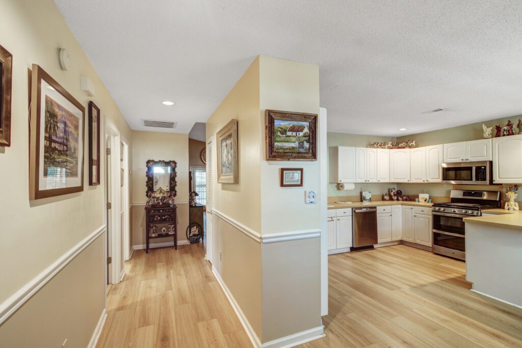 Exceptional home 15-20 minutes from downtown. Beautiful new floors and paint throughout. Large eat in kitchen features a new gas stove and oven. Both bedrooms have walk-in closets. The large open living and dining room combo has a recently inspected and serviced gas log fireplace which uses natural gas from newly installed gas lines from Dominion Energy. There are plantation shutters throughout the house. The screened porch outside the rear of the house has a tiled floor. Water is heated by a newly installed Rinnai tankless water heater using natural gas, saving lots of money on electricity. The roof is 3 years old. The main picture in photos was generated by AI in order to look like it is similar to what it looks like in June. A must see. Air conditioning system has been recently inspected and serviced. Main bedroom bathroom has custom tile. Home is move in ready. 5 trees cut down to open back yard for more sunlight. Front yard trees recently trimmed.